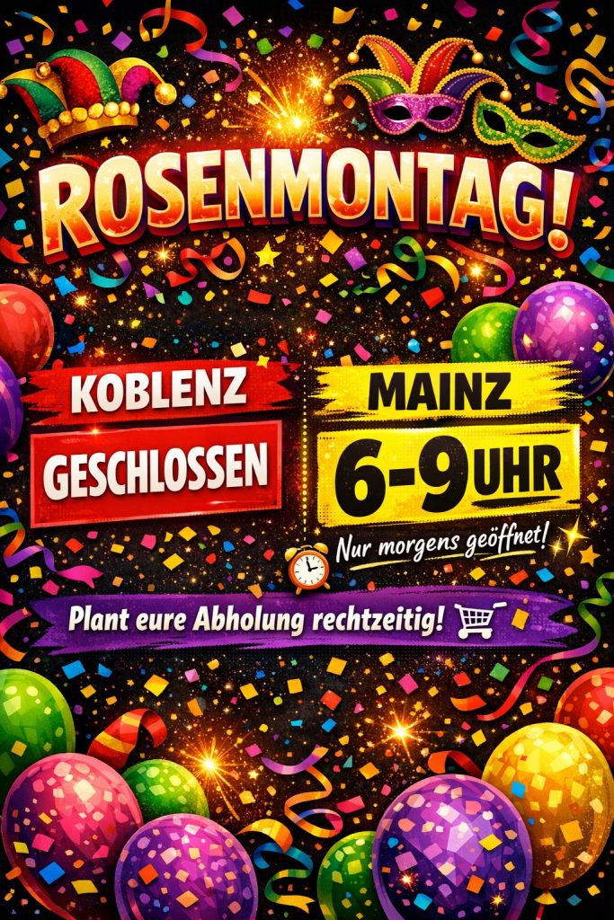 🎭 ROSENMONTAG „Achtung, geänderte Öffnungszeiten!“ Slide 2: 🔴 Koblenz – geschlossen 🟡 Mainz – 6–9 Uhr „Nur morgens geöffnet ⏰✨“ Von gaertner.admin|2026-02-13T07:58:58+01:00Februar 13th, 2026|Allgemein|0 Kommentare